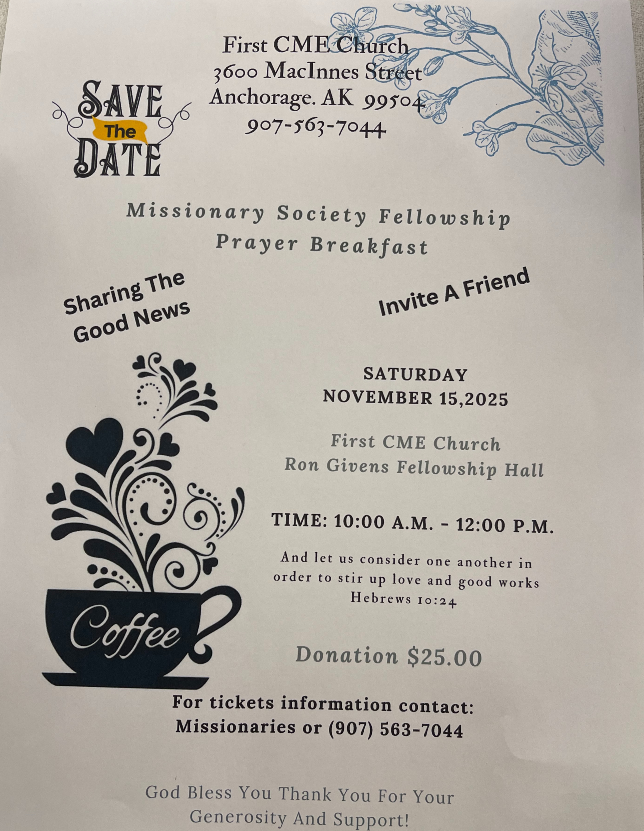 November 15 - First CME Missionary Society Prayer Breakfast.